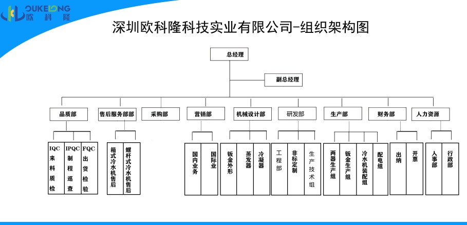 歐科隆制冷總經理辦公室下轄九大部門,分別為:品質部、售后服務部、采購部、營銷部、機械設計部、研發(fā)部、生產部、財務部、人力資源部。最高行政權、人事任免權為總經理所有。總經理下轄:銷售副總經理,副總經理。