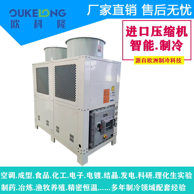 風冷箱式防爆冷水機是歐科隆制冷打開市場的拳頭產品,歐科隆制冷擁有廣泛的防爆冷水機配套經營,包括臭氧發生器,甲烷發電,化工化纖,石油天然氣,新型環保行業等,歐科隆防爆冷水機采用隔爆、增安、本安、正壓、充油、充砂、無火花、澆封和氣密等多種防爆方式,使機組可以在易燃易爆場合使用。