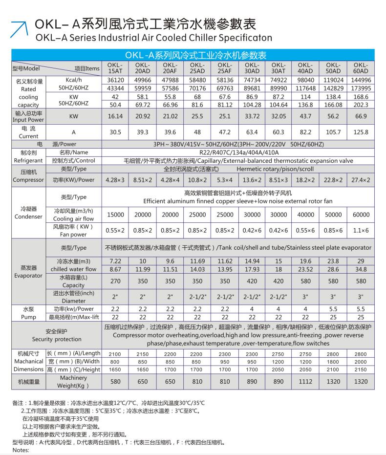 歐科隆牌風冷式冷水機之制冷心臟采用全密封低噪音,振動小,高效能省電進口名牌壓縮機,電器控制全部采用進口名牌原件,熱交換器采用殼管式冷凝器,換熱效能高,便于清洗保養。